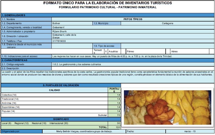 La descripción de las manifestaciones inmateriales consideradas atractivos turísticos potenciales se realizó de manera concisa y se refiere solo a aquellos aspectos sustanciales que potencialmente pueden contribuir a su salvaguarda y a un adecuado uso del atractivo para el diseño de productos turísticos. A partir de la información recolectada con participación de representantes de la comunidad cultural en la fase de diagnóstico, se elaboraron doce (12 ) fichas que se clasificaron en las siguientes categorías: gastronomía (pasteles caribeños, fritos típicos, arepa de huevo, dulces, dulce de mango), artesanías, expresiones musicales (música champeta y salsa), expresiones orales, juegos tradicionales ("bola de trapo"), festividades y eventos Cabildo de Getsemaní, corredor cultural "El Pedregazo", calle de las Tradiciones, galería al aire libre (ver anexo 1).