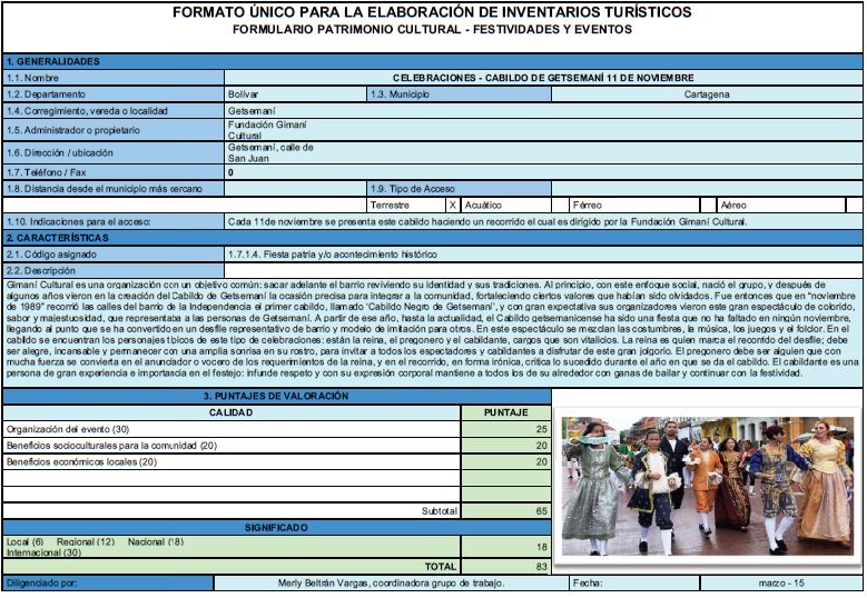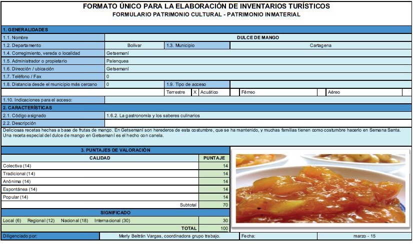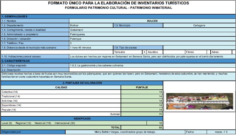 La información primaria y secundaria recolectada en la fase de identificación preliminar de las manifestaciones vigentes, pero vulnerables del patrimonio cultural inmaterial, se consolidó y sistematizó en las fichas de registro e inventario propuestas por el Min-CIT (2010), que se diligenciaron de manera conjunta con la participación de representantes de la comunidad y los integrantes del equipo de trabajo.