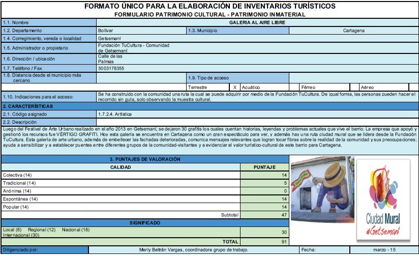 Se concreta por medio de los murales de Getsemaní, iniciativa mancomunada entre la misma comunidad, el sector público, el sector privado y la compañía Vértigo Graffiti, y desarrollada en el marco del 1.er Festival Internacional de Arte Urbano de Colombia. Esta iniciativa es considerada como una forma de interacción entre la historia y la cultura de Getsemaní y la experiencia de los visitantes, "creando nuevas oportunidades de desarrollo económico y social para su comunidad" (Ciudad Viva, 2013).