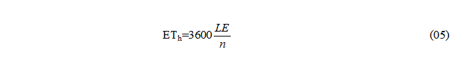 Os valores da evapotranspiração real diária – ETc (mm dia-1) foram obtidos a partir de extrapolação do valor instantâneo do LE (Equação 04). Com a estimativa do fluxo de calor latente foi possível determinar a evapotranspiração horária, aplicando a seguinte equação: