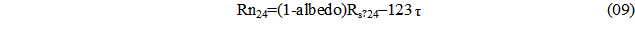 (09)albedo de superfície, Rs⇂24 é a média de 24 horas da radiação de onda curta, e a transmitância da atmosfera.