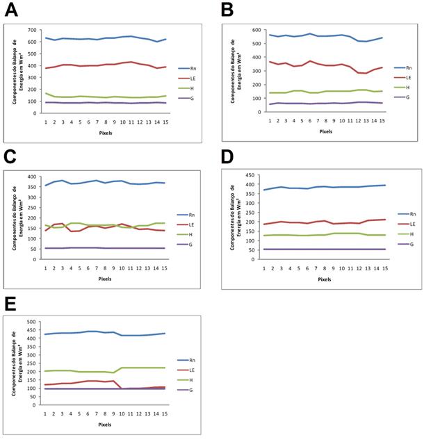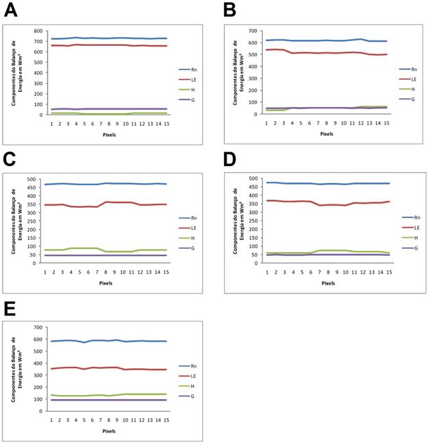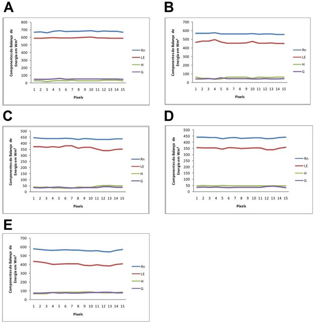 Nas figuras 6, 7 e 8 estão representada os valores de 15 pixels, os quais ilustra o processo de repartição do saldo de radiação - Rn pelos componentes do balanço de energia (Fluxo de calor Latente - LE, Fluxo de calor sensível - H e Fluxo de calor no solo - G) obtidos em áreas de recordes de floresta estacional decidual, áreas de agricultura irrigada e áreas da classe de solo exposto/pastagem/vegetação rala respectivamente para os dias estudados. Os gráficos A, B, C, D e E correspondem aos dias juliano 31 (31 de janeiro), 111 (21 de abril), 175 (24 de junho), 191 (10 de julho) e 255 (12 de setembro) respectivamente. Observa-se na figura 6 correspondente a área de floresta estacional decidual, que o saldo de radiação (Rn) apresentou variação entre 600 a 700 Wm-², onde á uma predominância do consumo dessa energia pelo fluxo de calor latente - LE. O fluxo de calor latente (LE) corresponde à quantidade de energia que é utilizada nos processos de evapotranspiração e na transpiração dos vegetais. Segundo Bastiaanseen et al. (1998), o LE liberado no processo de evapotranspiração é de suma importância para vários processos atmosféricos, uma vez que a intensificação ou dissipação de um sistema depende da disponibilidade de LE na região em que o mesmo se desenvolve.