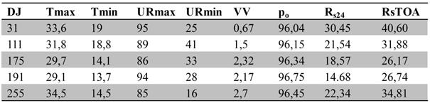 Outro fator importante para esses dias (175 e 191) é a quantidade de radiação solar global disponível, apresentando valores na ordem de 18,57 MJ m-2e 14,68MJ m-2, respectivamente, demonstrando uma diminuição dos valores registrados nos dias 31 e 111. No dia 255 há um aumento nos valores da evapotranspiração em relação aos dias anteriores; esse fato está associado a uma maior incidência de radiação solar global, devido à mudança na estação do ano, neste caso, início da primavera.
