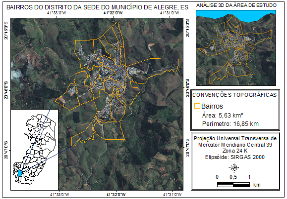 A área de estudo é representada pelos bairros do município de Alegre, localizada no extremo Sul do estado do Espírito Santo, Brasil. O município está localizado entre as coordenadas geográficas 20º 31’ e 20º 55’ latitude Sul e 41º 21 e 41º 39’ longitude Oeste (Fig. 1).