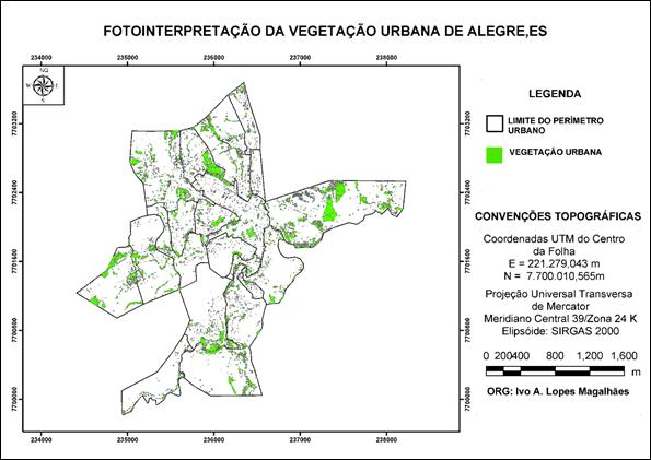 Realizou-se uma fotointerpretação da vegetação urbana do município de Alegre para quantificar a área com vegetação do perímetro urbano em hectares. Esta técnica foi realizada em uma escala constante de 1:2500, por meio da imagem de alta resolução espacial do satélite GeoEye-1. O alvo fotointerpretado foi à vegetação urbana do município, sendo desprezados todos os alvos diferentes a esta classe.