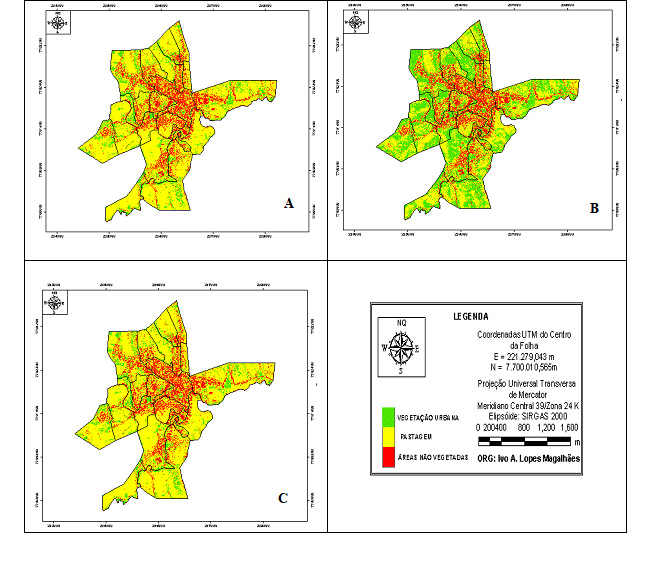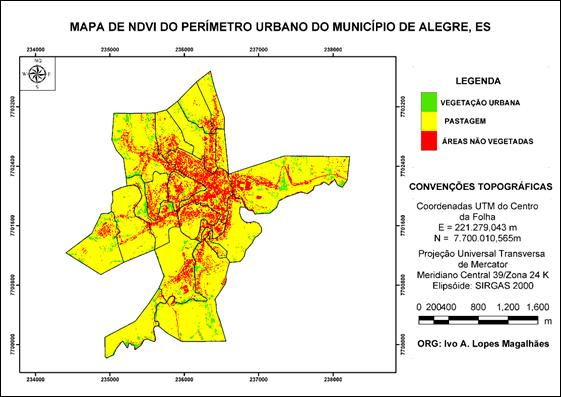 A mensuração da vegetação urbana foi elaborada por meio dos índices de vegetação: NDVI (índice de Vegetação da diferença normalizada) e SAVI (índice de Vegetação ajustado para o Solo). O NDVI foi fatiado em 3 classes distintas, com valores de: -1 a 0,1 para as áreas não vegetadas; 0,1 a 0,3 para as áreas pastagem e de 0,3 a 0,90 para as áreas de vegetação urbana. Após esse fatiamento a imagem NDVI foi transformada em vetor para assim mensurar a áreas não vegetadas, pastagem e vegetação urbana.