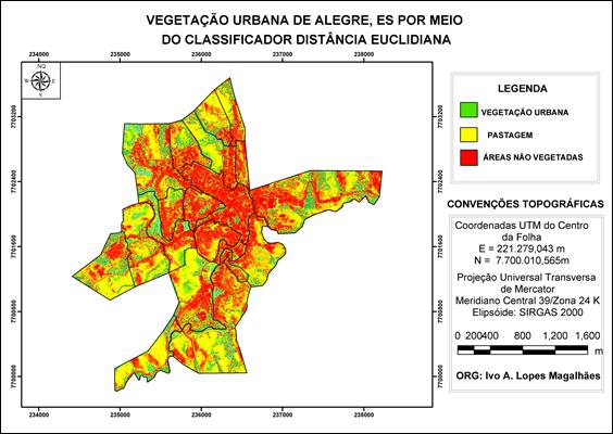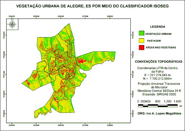 A área de vegetação urbana para o perímetro urbano de Alegre foi mensurado em 68 ha, representando 16,15% do município de Alegre, (Fig. 3). O trabalho de campo foi fundamental para solucionar as dúvidas referentes aos alvos inseridos abaixo das áreas com sombreamento na vegetação, sendo assim, aumentou a fidedignidade da área mensurada.