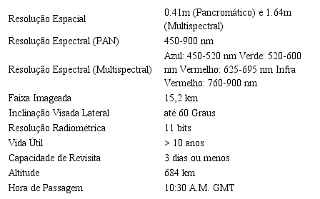Dentre os sistemas para aquisição de imagem de alta resolução tem-se o satélite GEOEYE-1, lançado em setembro de 2008, com um sensor óptico capaz de alcançar 41 cm de resolução espacial no modo pancromático e 1,6 metros no modo multiespectral. Na Tabela 1 são demonstradas as principais características do satélite GEOEYE-1.