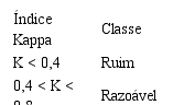 Congalton e Mead (1991) sugerem a utilização da estatística Kappa pelo fato de levar em consideração toda a matriz de confusão no seu cálculo, inclusive os elementos de fora da diagonal principal, os quais representam as discordâncias na classificação. As classes de intervalos de classificação do uso da terra foram classificadas conforme (CONGALTON; GREEN, 1998) (TABELA 2).