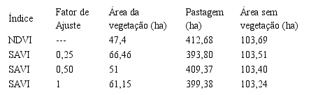A mensuração da vegetação urbana, pastagem e áreas sem vegetação, estimadas pelo NDVI e SAVI são apresentados conforme a Tabela 3.