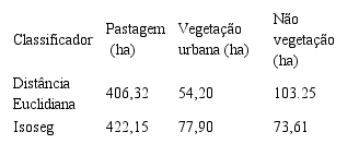 O classificador Isoseg mensurou a vegetação urbana em 77,90 ha, superestimando apenas 11,44 ha da vegetação urbana quando comparado com o SAVI 0,25 e 9,9 ha, quando confrontado com a fotointerpretação.