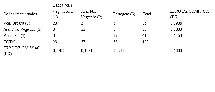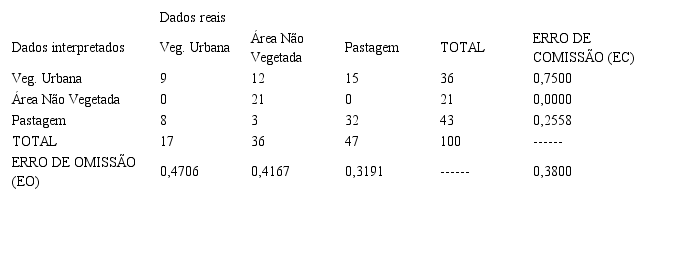 Por meio da Distância Euclidiana foi realizada a aquisição de diversas amostras significativas tanto para a classe de pastagem, vegetação urbana, no entanto o classificador interpretou de forma errônea algumas classes, omitindo 17% dos dados da classe de vegetação urbana e comissionando um acréscimo de 19% acrescentados nesta mesma classe.