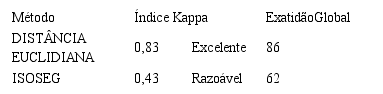 Analisando-se a tabela 6, pode-se observar que a Distância Euclidiana apresentou um resultado excelente para a classificação da imagem, com coeficiente Kappa de 0,83. Já o Isoseg apresentou o coeficiente Kappa de 0,43, sendo classificado em razoável. No entanto este resultado foi esperado, pois o classificador Isoseg apresentou resultados inferiores aos obtidos pela Distância Euclidiana, de acordo com os resultados dos erros de omissão e comissão (Tabelas 3 e 4).