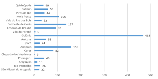 No que se refere ao VAB de serviços, segue a mesma dinâmica do VAB industrial, sendo Anápolis o município que mais se destaca nesse segmento, seguido por Inhumas, Itaberaí e Jaraguá. Nessa mesma dinâmica apresentada para o PIB, ao se observar a Figura 7, relativa ao número de estabelecimentos agroindustriais por microrregião, a microrregião de Goiânia se destaca com 33,26% (468 estabelecimentos) das empresas selecionadas para representar o setor agroindustrial, seguida pela microrregião de Anápolis que é objeto desse estudo com 11,30% (159 estabelecimentos). Enquanto, a microrregião Sudoeste de Goiás fica em terceiro lugar, com 9,74% (137 estabelecimentos), o que demonstra a importância da microrregião aqui estudada para a agroindústria goiana.