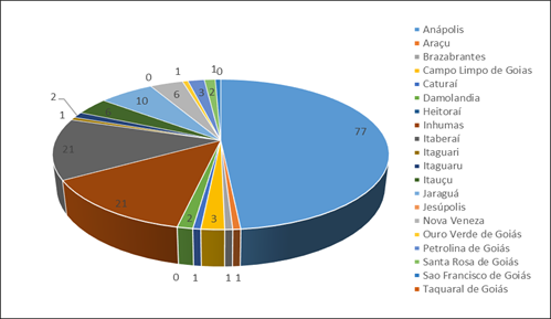 Pode-se evidenciar na Figura 8 que Anápolis concentra 48,43% (77 empresas) das agroindústrias da microrregião, seguidas pelos municípios de Inhumas e Itaberaí (21 empresas cada), totalizando 26,40% das empresas, enquanto Jaraguá conta com 10 estabelecimentos agroindustriais (6,29% do total).