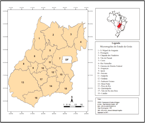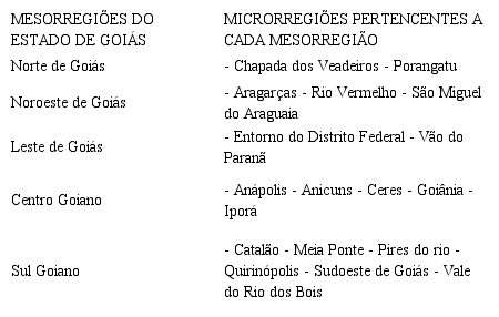 O estado de Goiás é subdividido em 18 microrregiões geográficas, sendo elas: Anápolis, Anicuns, Aragarças, Catalão, Ceres, Chapada dos Veadeiros, Entorno de Brasília, Goiânia, Iporá, Meia Ponte, Pires do Rio, Porangatu, Quirinópolis, Rio Vermelho, São Miguel do Araguaia, Sudoeste de Goiás, Vale do Rio dos Bois e Vão do Paranã (figura 1).