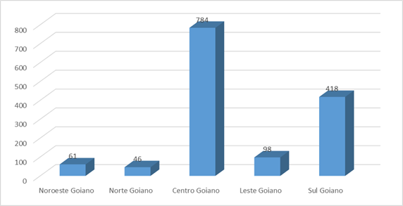 Tal fato, pode ser evidenciado ao se analisar os dados da Figura 4, ao verificar-se que as Mesorregiões Centro e Sul Goiano, tomadas em conjunto, detêm 85,43% (1202 empresas de um total 1407) das empresas selecionadas para representar o setor agroindustrial[1]. Nesse sentido, pode-se observar que a mesorregião Centro Goiano destaca-se com relação à fabricação de Produtos de Carne, laticínios, calçados e artefatos de couro, e a mesorregião Sul Goiano destaca-se na fabricação de açúcar e álcool.