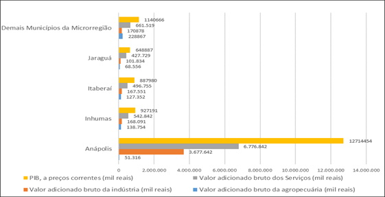 Em relação ao segmento industrial, a cidade de Anápolis, em 2014, respondia sozinha por 85,81% (R$ 3.677.642 mil) do VAB industrial da microrregião (Gráfico 2), seguida pelos municípios de Inhumas (3,92%), Itaberaí (3,91%) e Jaraguá (2,38%). Assim, a soma do VAB industrial dos demais municípios da microrregião não passa de R$ 170.878 mil (3,99% do total), o que demonstra a concentração industrial na cidade de Anápolis e nos subpolos da microrregião, em detrimento dos demais municípios da microrregião.