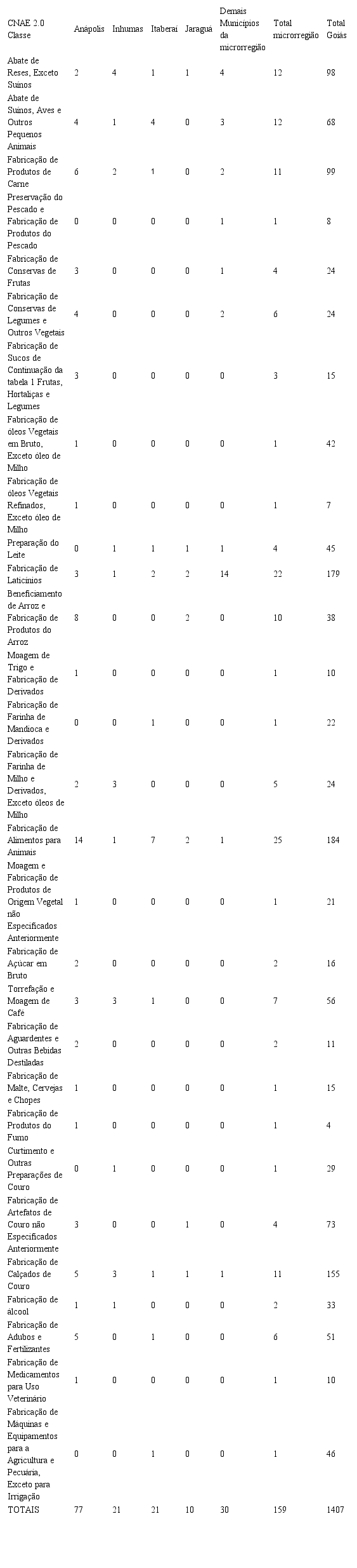 Ainda, conforme Luz (2009), o município de Inhumas também se destaca no contexto da microrregião, exercendo influência sobre um subespaço formado pelos municípios que integram a Rede Integrada de Desenvolvimento de Goiânia (RIDG), sendo eles: Inhumas, Brazabrantes, Damolândia, Nova Veneza e Caturaí. Dessa forma, para efeito de análise, serão considerados individualmente os dados da cidade polo (Anápolis) e dos subpolos: Itaberaí, Inhumas e Jaraguá (Luz, 2009). Já os demais municípios, serão considerados em conjunto, como forma de melhor visualizar a distribuição da atividade agroindustrial dentro da microrregião.