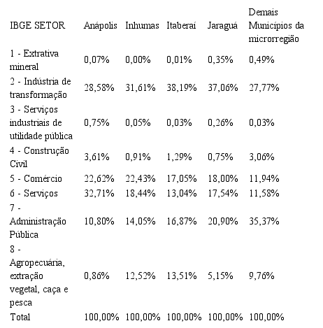 Os demais municípios da microrregião juntos possuem apenas 25% das empresas selecionadas para o estudo, com destaque para as empresas relacionadas à cadeia do leite (14 empresas). Mas esses municípios apresentam alto grau de dependência das atividades primárias, por exemplo, a agropecuária, responsável por 9,76% dos postos de trabalho ativos, contra 0,86% em Anápolis, cidade com uma economia mais diversificada (Tabela 2). Esses municípios também apresentam atividades comerciais e de prestação de serviços, porém pouco desenvolvidos, são setores normalmente responsáveis pela maioria dos empregos formais. Empregam apenas 11,94% e 11,58% da população respectivamente, enquanto nos municípios polo esse percentual varia na casa de 17 a 22% para o comércio e de 13 a 32% para os serviços (tabela 2). Destaca-se, que nesses municípios menores, o grande responsável pelos empregos formais é o poder público (35%).