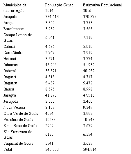 A microrregião de Anápolis possui 540.220 habitantes, segundo informações censitárias de 2010 do Instituto Brasileiro de Geografia e Estatística (IBGE/Censo Demográfico, 2010) com população estimada de 594.914 habitantes para 2016 (IBGE/Cidades, 2017), registrando em 2014, um Produto Interno Bruto de R$ 1.631.917.700,00 (IBGE/Cidades, 2014), cuja geração possui significativa contribuição das atividades ligadas ao agronegócio (11,3%, do PIB, segundo dados do IMB,2014).