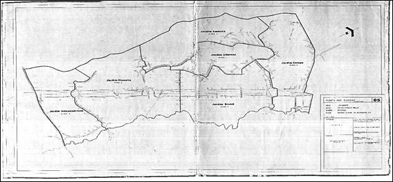 Para o arquiteto que projetou o loteamento, é latente o interesse num projeto democrático para a área e não elitizado. A intenção em democratizar o loteamento esteve pautada no preço, tamanho e nos tipos de lotes. Todo esse cenário resultou na divisão do loteamento em seis glebas (figura 2), intitulada Divisão das Glebas, que especifica a localização e nome de cada uma, sendo elas Jardim Alterosa, Jardim América, Jardim Europa, Jardim Brasil, Jardim Planalto e Jardim Independência (PMMOC, 2017).