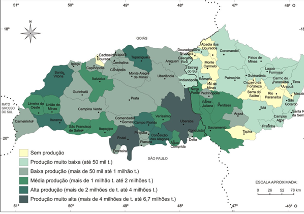 Durante as décadas de 1980 e 1990, é notório o destaque ao Cerrado nos programas direcionados ao desenvolvimento da agricultura, a região é tida como grande celeiro de alimentos como espaço de progresso e produção, de tecnologia avançada, uma vez incentivadora da exploração da agricultura de forma racional (CLEPS JR, 2009, 2016). Entretanto, não emergem, no discurso governamental, os indicadores do caráter excludente da modernização da agricultura, a concentração fundiária e a elevada sazonalidade do emprego agrícola no campo, grupos de trabalhadores encontram trabalho somente no pico da safra agrícola, úteis em culturas modernas como força de trabalho em tarefas ainda não mecanizadas.É neste contexto que a mesorregião Triângulo Mineiro/Alto Paranaíba, assim como outras regiões inseridas no domínio dos Cerrados, conhece significativa expansão dos cultivos na primeira década do século atual (Grafico 3, Figuras 2 e 3), afirmando-se como a principal região produtora de Minas Gerais (mais de 70% da produção do estado).