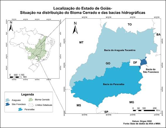 A região delimitada para o presente trabalho é o Estado de Goiás, por encontrar-se inserido no bioma Cerrado. O estado localiza-se na região Centro-Oeste do Brasil, ocupa uma área de 340.086 km² e limita-se ao norte com o Estado do Tocantins, ao sul com Minas Gerais e Mato Grosso do Sul, a leste com Bahia e Minas Gerais e a oeste com Mato Grosso. Goiás é banhado por quatro bacias hidrográficas: a Bacia do Rio Paranaíba, a Bacia do Rio Tocantins, a Bacia do Rio Araguaia e uma pequena porção da Bacia do Rio São Francisco (IBGE, 2020) (Figura 1).