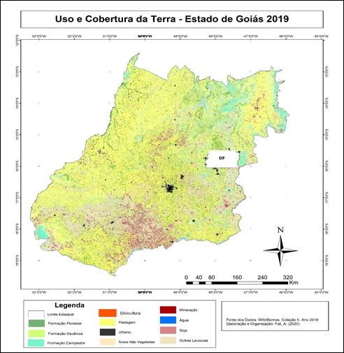 Dados atualizados do Map Biomas (2020) sobre o uso e ocupação do solo no território goiano, referentes ao ano de 2019, apontam que a área de pastagem corresponde a 15.697.275,58 ha; a formação savânica abrange aproximadamente 6.237.418,32 ha; a formação florestal corresponde a 4.166.740,65 ha; a área de agricultura abrange 5.756.690,47 ha; a formação campestre corresponde a 1.370.093,64 ha, dentre outros usos (Figura 2).
