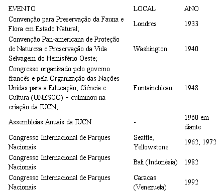 Sendo assim, baseado em Silva e Cunha (2010, p. 129), optou-se por destacar alguns dos principais eventos realizados no mundo visando aprimorar e traçar conceitos acerca das áreas protegidas. É interessante notar que, a experiência adquirida nestas, e em outras conferências culminou na criação de organismos internacionais que buscam elaborar regulações acerca das áreas protegidas (Quadro 1).