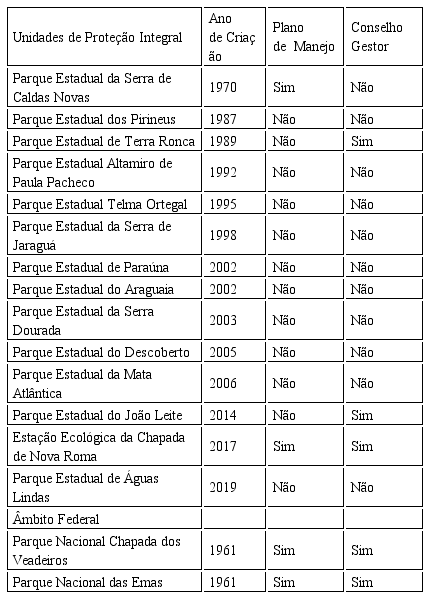 Em relação às Unidades de Proteção Integral, apenas o Parque Estadual da Serra de Caldas Novas, unidade criada em 1970, e a Estação Ecológica da Chapada de Nova Roma, criada em 2017, possuem Plano de Manejo; já o Parque Estadual de Terra Ronca, o Parque Estadual do João Leite e a Estação Ecológica da Chapada de Nova Roma são as únicas unidades que possuem Conselho Gestor. Os dois parques nacionais do Estado possuem ambos.