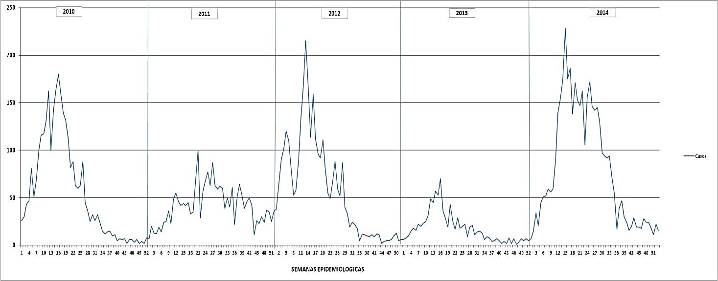 El Dengue en los años de estudio, con una línea de tendencia polinomial de orden 5; observó variabilidad de datos de los años 2010, 2012 y 2014 con respecto a la línea de comportamiento, y sus puntos son lejanos a la línea de tendencia. Se suma a este modelo la observancia de los puntos de la tendencia que se acercan al comportamiento, en los años 2011 y 2013, con menos puntos de acercamiento en el año 2011 y más cercano a los puntos de tendencia en el 2013.