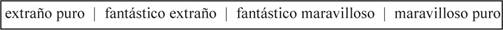 En este esquema el/lo fantástico en estado puro está representado simbólicamente por la línea mediana que deslinda el/lo fantástico-extraño del (de lo) fantástico-maravilloso; línea que refleja muy bien la naturaleza del (de lo) fantástico, como frontera entre dos áreas vecinas (Todorov, 1973: 62-63).13