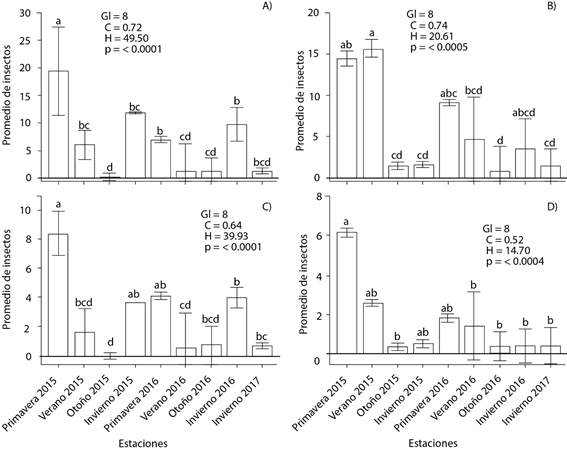 Primavera del 2015 se caracterizó por presentar temperaturas de hasta 13 ºC y alta abundancia de descortezadores de hasta 400 en total (Figura 2 B), la mayor abundancia registrada en esta estación se debe a las temperaturas altas, ya que en las estaciones con menor presencia de descortezadores la temperatura fue menor a 10 ºC. Los resultados obtenidos concuerdan con Sánchez-Martínez et al. (2008) y Rodríguez et al. (2010), al reportar primavera como la estación de mayor incidencia de descortezadores (n = 20 y 6.53 en promedio, respectivamente) en P. arizonica y P. hartewgii Lindl. Estos autores mencionan a otoño con alta incidencia de descortezadores, lo cual no concuerda con este estudio, ya que aquí otoño fue la estación con menor número de individuos. En el estado de Veracruz, en cambio, se observaron hasta 170 individuos de D. adjunctus en P. rudis durante la primavera (Rodríguez et al., 2013). Por su parte, Vázquez et al. (2007) mencionaron que la mayor fluctuación de D. mexicanus en Michoacán (ambos estudios en México) se presentó de marzo a junio, durante actividades de aprovechamiento, cuando los árboles fueron más susceptibles a ataques de insectos.