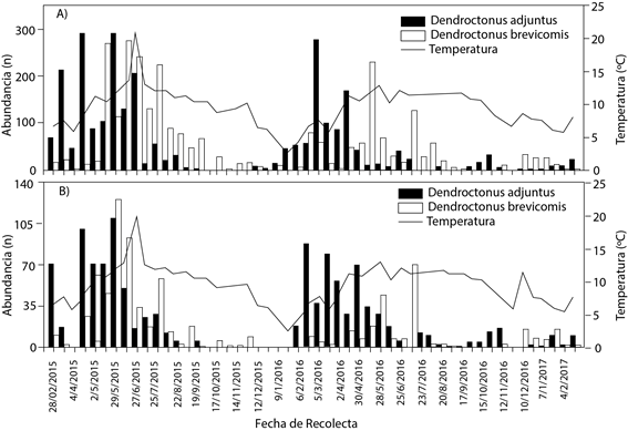 La abundancia de D. adjunctus fue estadísticamente diferente entre estaciones del año (p < 0.0001), siendo mayor en primavera del 2015 en ambos transectos con 19.46 (transecto A) y 8.35 (transecto B) insectos en promedio y casi nula en otoño del 2015 (n = 0.21 en transecto A y n = 0 en B) (Figura 1 A y 1 C). D. brevicomis presentó un patrón similar; las estaciones de mayor vuelo de descortezadores fueron verano del 2015 (transecto A) y primavera del 2015 (transecto B) promediando 15.64 y 6.13 insectos, respectivamente en cada estación. Otoño del 2015 y 2016 fueron las estaciones donde hubo menor presencia de D. brevicomis (n = 0.94 transecto A y n = 0.33 transecto B) (Figura 1 B y 1 D). En el transecto A las temperaturas más altas se registraron en primavera y verano del 2015, siendo de 10 y 13 ºC, respectivamente, ocurriendo aquí la mayor abundancia de insectos. En las estaciones con menor presencia de descortezadores (otoño 2015 y 2016) las temperaturas fueron de 9.10 y 8.83 ºC (Figura 2 A); para el año 2016 se presentó un patrón similar en la abundancia de descortezadores (Figura 1A y 1B).