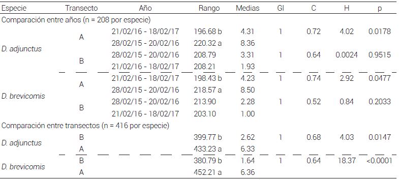 Para caracterizar la distribución temporal y altitudinal de cada especie de descortezador, los datos de abundancia se organizaron en los siguientes niveles: por año, estación del año, altitud y transecto. Previo a la comparación y por ser información proveniente de conteos periódicos, los datos se sometieron a una prueba de normalidad de Shapiro-Wilk (α = 0.05); al no cumplir con este supuesto, la comparación de abundancia de insectos en cada nivel se realizó usando la prueba no paramétrica de rangos de Kruskal-Wallis (KW) al 95 % de confiabilidad (Kruskal y Wallis, 1952). Para comparar la abundancia de cada especie de descortezador por año en cada transecto se usó el total de repeticiones sin importar la altitud (n = 208 por especie por año). Entre transectos el análisis se realizó incluyendo el muestreo de ambos años sin importar la altitud (n = 416 repeticiones por especie). En la comparación de abundancia de descortezadores entre estaciones, las repeticiones variaron desde n = 48 hasta 52 (por el número de semanas, pero separadas por año de evaluación y por transecto). La comparación de abundancia entre altitudes incluyó el total de muestras por sitio sin importar el año (n = 52).
