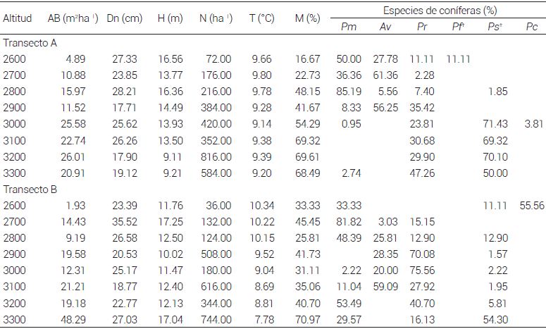 La prueba de Kruskal-Wallis demostró que la mayor abundancia de D. adjunctus en ambos transectos (A y B) ocurre a los 3300 msnm (n = 12.62 transecto A y n = 9.75 transecto B) (Figura 3 A y 3 C). D. brevicomis mostró un patrón similar, mayor en el transecto A, a los 3000 msnm y en el transecto B a los 3300 msnm con medias de 18.92 y 4.62 insectos, respectivamente (Figura 3 B y 3 D). La menor cantidad de insectos de ambas especies ocurrió de los 2600 a 2800 msnm. El intervalo altitudinal de 3000 a 3300 m se caracterizó por presentar alto porcentaje de la especie hospedera (P. rudis), mayor densidad del arbolado (400 a 800 árboles ha-1) en ambos transectos y alto porcentaje de mortalidad de árboles (hasta 70 % en ambos transectos) (Cuadro 2).