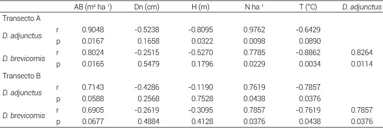 Las correlaciones entre la abundancia de D. adjunctus y D. brevicomis en los sitios a lo largo de los transectos fueron significativas (r > 0.70 y p < 0.03) en ambos transectos. La abundancia de ambas especies de descortezadores se correlacionó positiva y significativamente con el área basal (r > 0.70 y p < 0.05), con el número de árboles por hectárea (r > 0.76 y p < 0.04), pero negativamente con la temperatura promedio en los sitios (r > 0.60 y p < 0.08) (Cuadro 3). Los resultados obtenidos en el presente estudio son similares a los de Sánchez y Silva (2008), donde mencionan correlaciones significativas entre la abundancia de insectos con el área basal (r = 0.806; p > 0.0001). Hayes et al. (2008) demostraron que entre más área basal exista mayor será la abundancia y mayor el ataque de Dendroctonus. Los resultados obtenidos y los reportados por otros autores han demostrado que las características de los sitios de estudio (altitud, área basal, diámetro, especies hospederas y la densidad del arbolado) influyen en la fluctuación de los insectos descortezadores.