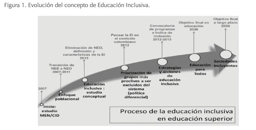 El men y el Centro de Innovación y Desarrollo (cid) (2007) iniciaron un estudio sobre educación inclusiva para la construcción de una política que promueva la educación superior inclusiva en Colombia. El estudio fue realizado a 127 ies colombianas y evidenció un incremento en la tasa de accesibilidad a la educación superior de la población diversa, en un 908 % entre el 2007 y el 2011. El men inició un proceso de reflexión sobre la integración y las necesidades educativas especiales con relación a la exclusión de otros grupos sociales, como los étnicos. Ante dicha problemática, en el año 2011 propuso abordar las necesidades educativas diversas, ned, como un cambio de paradigma, para incluir a otros grupos poblacionales en el sistema educativo. Se inició un camino para valorar y potenciar la diversidad. Para el año 2012, el men continuó la discusión por el término necesidades, que hacía alusión a una patologización de la población diversa; se inició la construcción conceptual de la educación inclusiva para el país, en aras de identificar las barreras para el aprendizaje y la participación de todos los estudiantes de los diferentes niveles del sistema educativo colombiano y se construyeron los “Lineamientos de la política de educación superior inclusiva”, publicados a partir del 30 de septiembre de 2013.