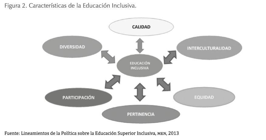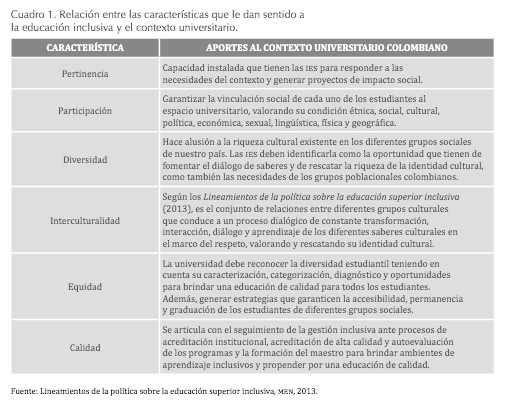 En el cuadro 1 se describe la relación existente entre las seis características del concepto de educación inclusiva y el contexto universitario colombiano.
