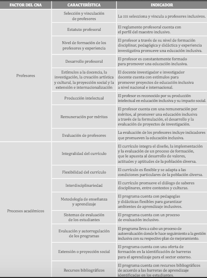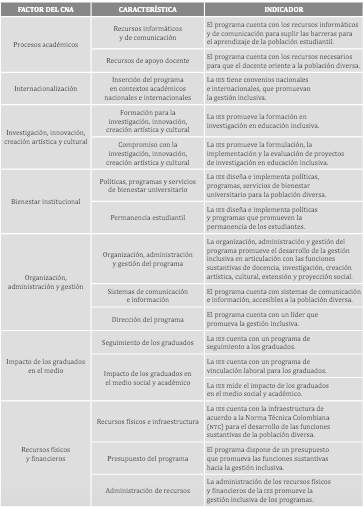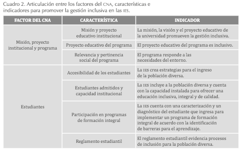 En el cuadro 2 se muestra una propuesta para articular los indicadores de la gestión inclusiva en las ies y los procesos de acreditación de alta calidad y autoevaluación de los programas a los diez factores y características propuestos por el cna (2014), con el fin de promover la equidad y la participación activa de la población diversa en las ies, en aras de brindar una educación pertinente y de calidad.