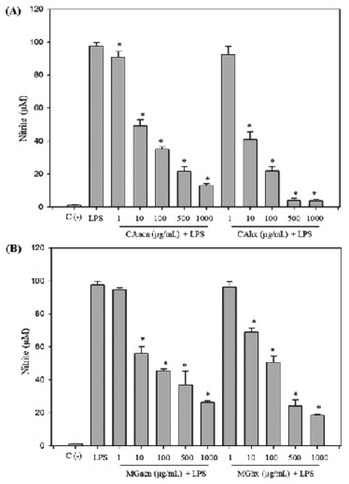 Different models were used to evaluate the anti-inflammatory effects of C. aromatisans and M. grandiflora. The in vitro experiments were performed using the nitric oxide test. It is well known that during an inflammatory process, after signalling events, macrophages induce the expression of pro-inflammatory enzymes such as inducible nitric oxide synthase (iNOS). This enzyme is regulated by the secretion of pro-inflammatory cytokines and produces NO from L-arginine. Large amounts of NO can cause severe collateral damage in the tissue because NO can form peroxynitrite (ONOO-), a cytotoxic molecule related to inflammatory pathologies. For this reason, the regulation of the production of NO is an important target for inflammatory diseases (Guzik et al., 2003).