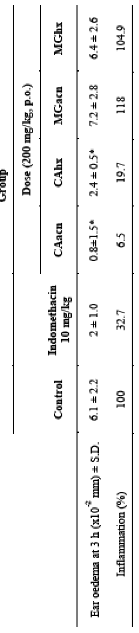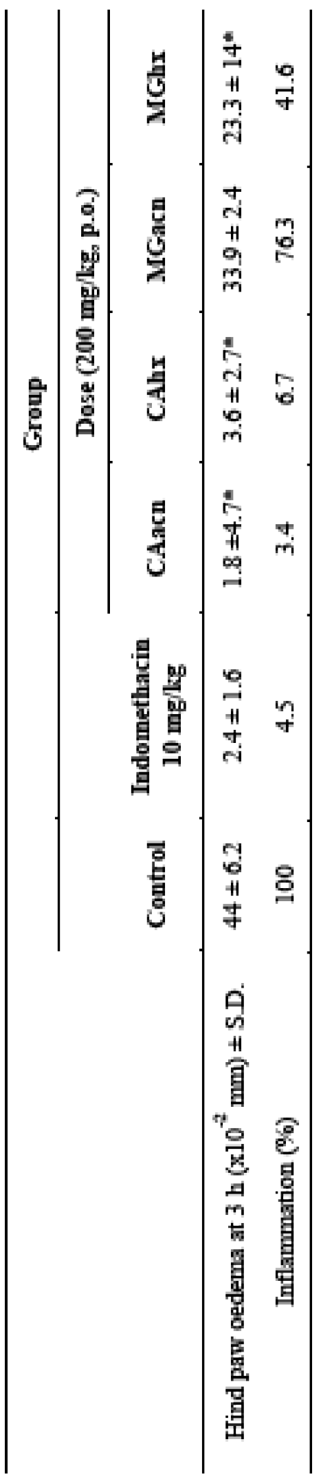 In the carrageenan-induced hind paw oedema model (table 1), the non-polar (CAhx) and polar extracts (CAacn) of C. aromatisans at the dose of 200 mg/kg resulted in the maximum inhibition (92 and 96%, respectively) of paw oedema at 3 h after carrageenan injection. Similar results were obtained for the TPA-Induced mouse ear oedema model (table 2), in which both extracts of C. aromatisans showed anti-inflammatory effects of up to 80% at the same dose. These effects were similar in both cases to the effects of the anti-inflammatory drug indomethacin. In contrast, the extracts obtained from M. grandiflora showed lower values of reduction of inflammation in the carrageenan-induced hind paw oedema model (table 2). In the TPA-induced mouse ear oedema model, no anti-inflammatory effect was observed for the non-polar or polar extract of M. grandiflora at the dose of 200 mg/kg.