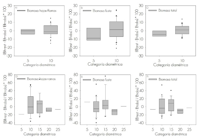 El modelo 3 registró un error mayor en la categoría de 10 cm en Bhr (Figura 2A); caso contrario para Bt (Figura 2C) en la categoría de 5 cm; y en Bf (Figura 2B) al modelo 4 le correspondió el error más alto en la categoría de 5 cm. Aunque para P. halepensis, el modelo 2 registró un menor error en la categoría 15 del componente fuste (Figura 2E) en comparación con el resto de las categorías. En Bhr (Figura2 D) y Bt (Figura 2F) el modelo tuvo menores errores en las categorías de 10 cm.