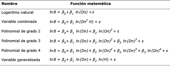 La estimación de biomasa por componente (hojas-ramas, fuste y total) se realizó mediante modelos logarítmicos de regresión (Cuadro 1), los cuales se ajustaron con el método de Cuadrados Mínimos en el paquete estadístico R Project (R Core Team, 2017). La transformación logarítmica es de gran utilidad, ya que corrige la heterogeneidad de la varianza de la variable independiente, con respecto a los datos de la variable dependiente (Brown et al., 1989). Es necesario hacer la transformación, porque la varianza es altamente inestable en unidades aritméticas y la transformación logarítmica rectifica el problema (Baskerville, 1972). Se evaluaron seis modelos con los estadísticos: coeficiente de determinación ajustado (R2 adj), error estándar (Syx) y la significancia de los parámetros de regresión (P < 0.05).