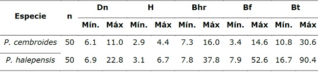 Los árboles de P. halepensis presentaron mayores diámetros normales y alturas en comparación a P. cembroides; y se registraron diferencias en biomasa de hojas-ramas (Bhr), biomasa de fuste (Bf) y biomasa total (Bt) de 21.8, 38.0 y 59.8 kg, respectivamente con P. cembroides (Cuadro 2).