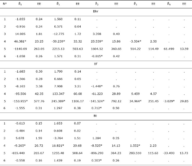 Únicamente los modelos 4 y 6 no mostraron significancia (P > 0.05) en los parámetros de estimación en Bhr y Bt; para Bf los parámetros tampoco fueron significativos en los modelos 3, 5 y 6. Con la misma variable independiente de diámetro normal, pero con diferentes modelos en biomasa total Díaz et al. (2007) y Rodríguez-Ortiz et al. (2012) indican parámetros más pequeños a los de este estudio (P. cembroides) de β 0 = 0.035 y 0.001 y β 1 = 2.691 y 1.980 respectivamente en P. patula Schiede ex Schltdl. & Cham. (Cuadro 3).