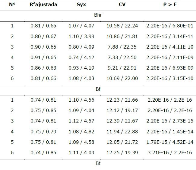 De los seis modelos probados, en P. cembroides se seleccionó el 3, ya que presentó los mejores estadísticos en Bhr y Bt, con un coeficiente de determinación ajustado (R2 adj) por arriba de 0.90; en cambio para Bf fue el modelo 4 (R2 adj de 0.75) con una R2 adj promedio de 0.86 (en Bhr, Bf y Bt). Sin embargo, para P. halepensis se eligió el modelo 2 en Bhr, Bf y Bt, con una R2 adj promedio de 0.79 (Cuadro 5).