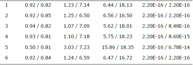 En Pinus halepensis, los modelos 1 y 2 arrojaron parámetros con diferencias significativas (P < 0.05) en comparación con el resto de los modelos en Bhr y Bt; en cuanto a Bf, los parámetros de los modelos 1, 2 y 6 presentaron diferencias significativas (P < 0.05); lo contrario se obtuvo para los modelos 3, 4 y 5. El modelo 2 presentó cierta similitud en los parámetros de (β1) 0.444 en Bhr, (β1) 0.633 en Bf y (β1) 0.540 en Bt (Cuadro 4).