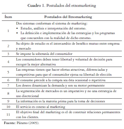 En las incertidumbres y los múltiples caminos abiertos para enfrentar al consumidor de hoy, el etnomarketing, como disciplina de pensamiento y acción organizacional en la cual la cultura, desde la antropología y la etnografía, es tomada como el emprendedor y avasallador mecanismo que estimula y da respuesta a las relaciones comerciales en cada variable y en los a veces casi inexpugnables segmentos de mercado, se apoya en los siguientes postulados (Páramo, 2004):